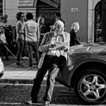 We found out later when we followed their trail, that of course the finishing line was on the same raised plinth they had set off from, right on the other side of town, and then when they had finished they stopped all over the place to meet friends and relatives, drink champagne, phone their mates and do all the other essentials of life. We mixed in amongst them as we did at the start of the race and let the jolly atmosphere rub off on us. It really was fun and hopefully when we get back home we will have snapped one or two good photographs to remember this by. When they had calmed down the drivers jumped back in their cars and paraded through the town again, often with mates perched in odd places on the backs of cars all waving wildly as they were cheered past every bar and restaurant. We also had lunch in a restaurant by the roadside and joined in the cheering as the cars tooted and roared by, in between mouthfuls of pizza! Finally the cars ended up back in said Piazza where in the end they were all parked up. It made me smile that they were all given a metre square piece of card to catch the oil leaks so the Piazza didn’t get spoilt and indeed there were many leaks in many places, and the Piazza will still need cleaning!