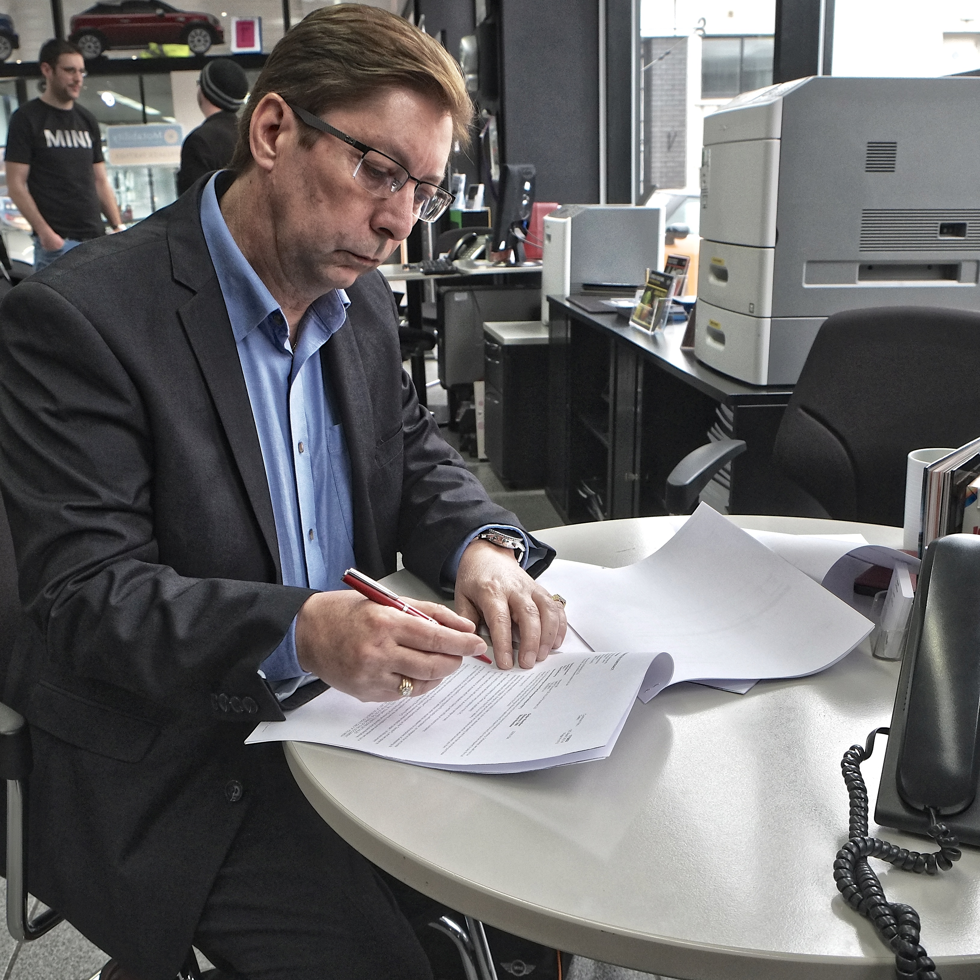 So that was that and we placed an order for a new Paceman SD in blazing red with a white roof. we were careful with the options list and omitted the roof bars as CooperBeast never had these and similarly we deliberately omitted the tinted rear glass as again this was not on CooperBeast. We also did not opt for the black headlights as agin CooperBeast never carried these. We have added spots lights, because CooperBeast has these and we will be adding the white A-panels with MINI Cooper laurels as per the styling of CooperBeast and of course he will wear the GP style roof numbers that all our cars have carried. White bonnets stripes were ordered too, because again CooperBeast has them. Like CooperBeast he will come on silver alloys and just like CooperBeast these will be changed out for white wheels. This should see the Paceman, having clearly recognisable style cues from the looks of our original generation one new MINI. Signing the deal then, as in the photo above was an exciting moment.